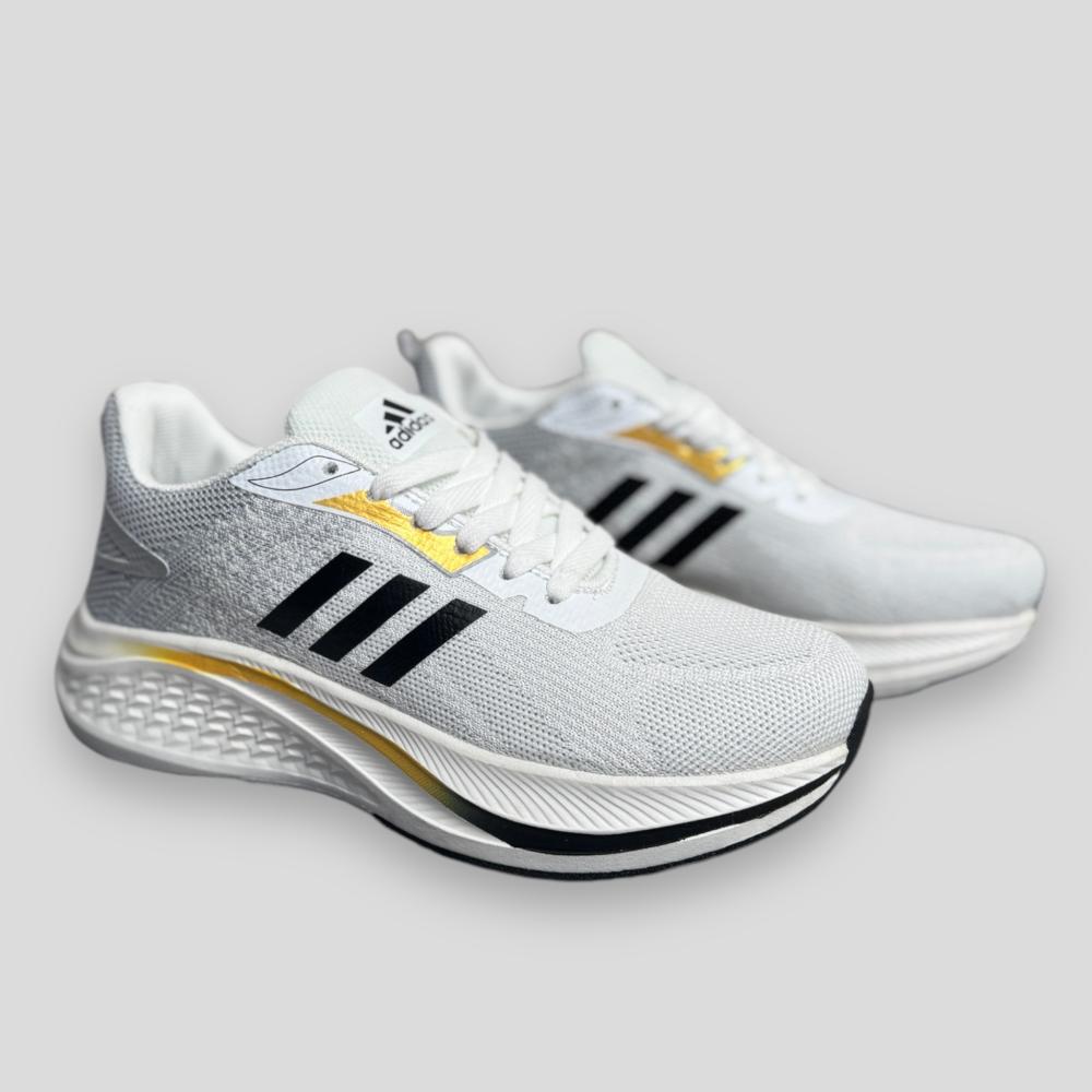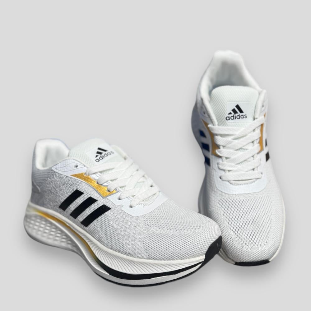 - الحذاء يأتي بلون أبيض أنيق مع لمسات صفراء زاهية وثلاثة خطوط سوداء كلاسيكية، مما يضفي مظهرًا أنيقًا ومميزًا يناسب جميع الأذواق.